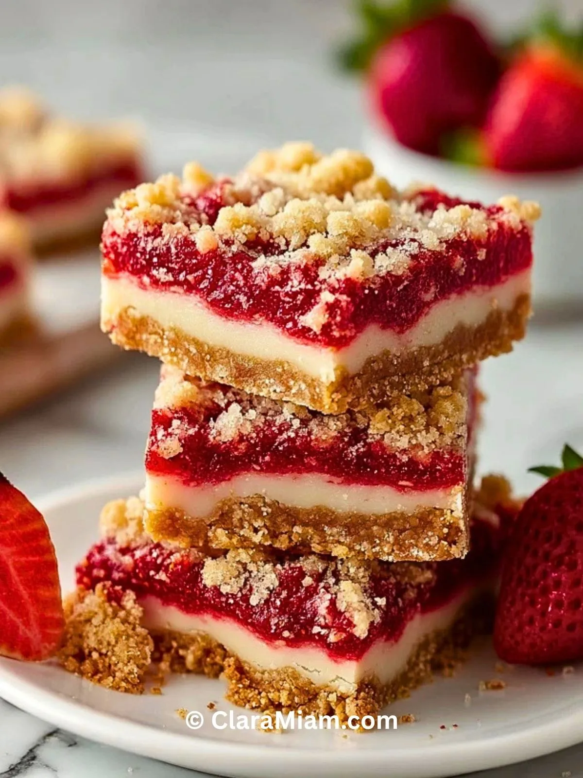 Keywords: barres croquantes aux fraises, dessert aux fraises, barres sablées, recette facile, cheesecake bars, crumble fraise