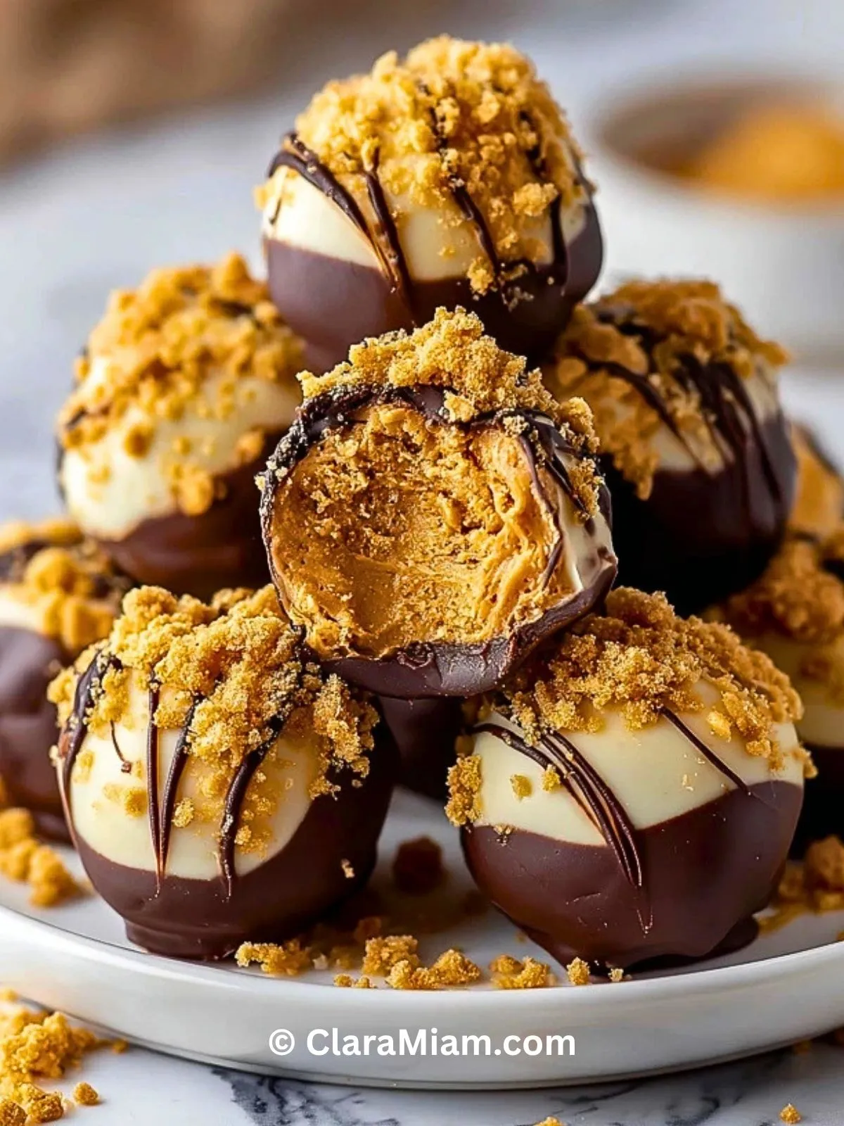 Avant que le chocolat ne durcisse complètement, ajoutez quelques miettes de biscuits sur le dessus. Vous pouvez aussi verser un fin filet de beurre de cacahuète légèrement réchauffé pour une finition encore plus gourmande. Replacez les billes au réfrigérateur jusqu’à ce que l’enrobage soit bien pris.