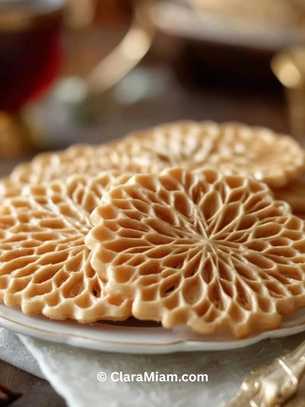 Biscuits pizzelle traditionnels italiens, fins, croustillants et délicatement parfumés à l’anis. Une douceur élégante parfaite pour accompagner le café, le thé ou pour les fêtes.