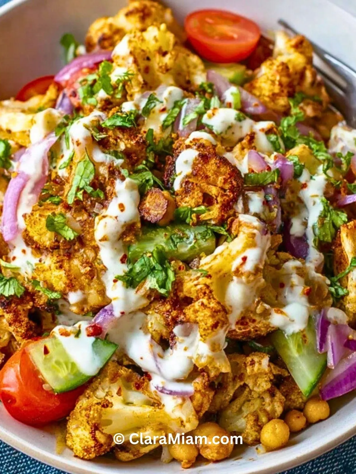 Un bol végétarien complet, savoureux et nourrissant, à base de chou-fleur rôti façon shawarma, pois chiches croustillants, sauce tahini citronnée et légumes frais. Idéal pour un repas sain, coloré et facile à préparer en avance.