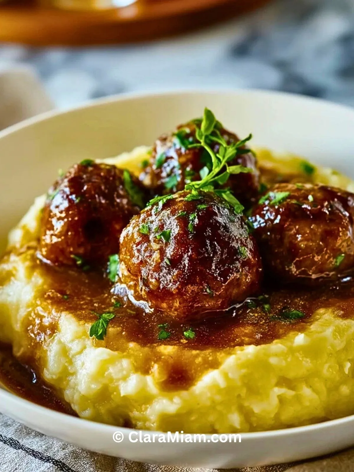 Servez les boulettes nappées de sauce sur la purée, parsemées d’herbes fraîches.