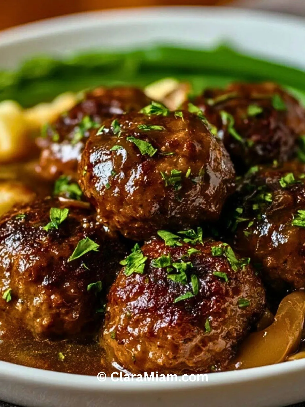 9. Dresse la purée chaude au fond des assiettes, dispose les boulettes par-dessus et nappe généreusement de sauce. Parsème de persil si tu le souhaites et sers aussitôt.