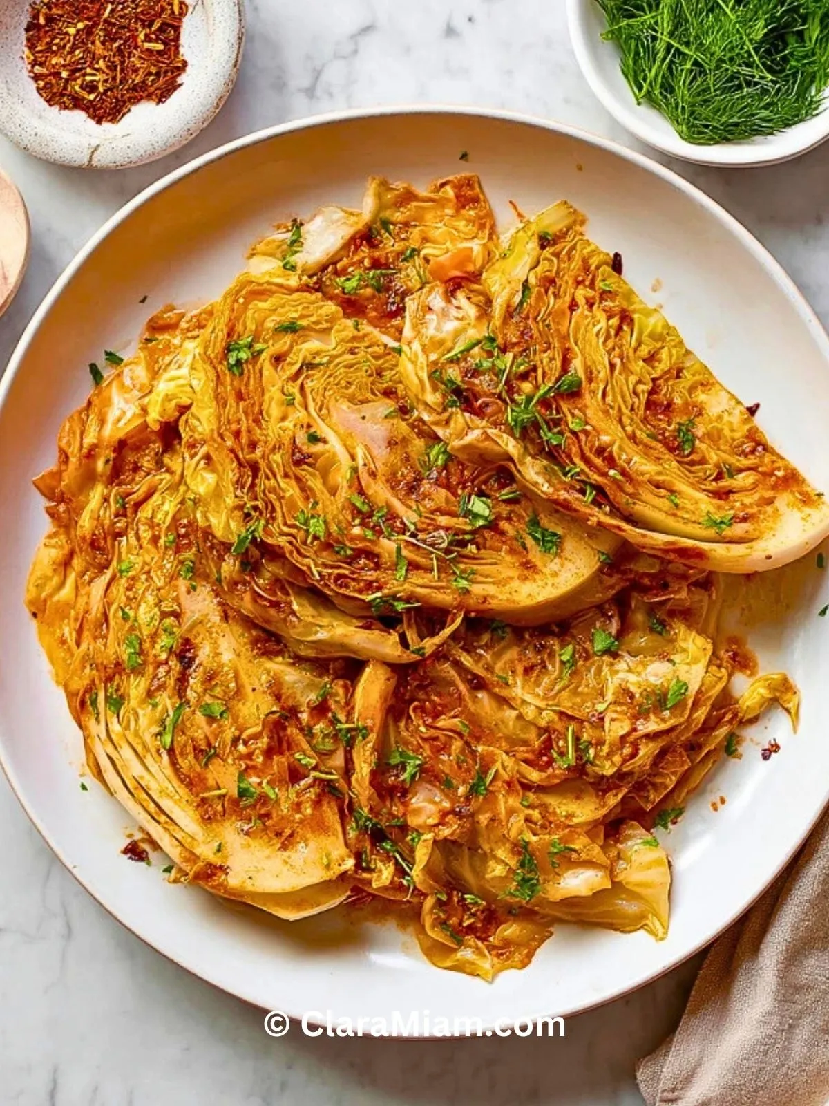 Chou blanc rôti au four, bien assaisonné et doré, ultra fondant et parfumé aux épices et herbes fraîches. Un accompagnement sain, gourmand et facile qui convertit tout le monde au chou !