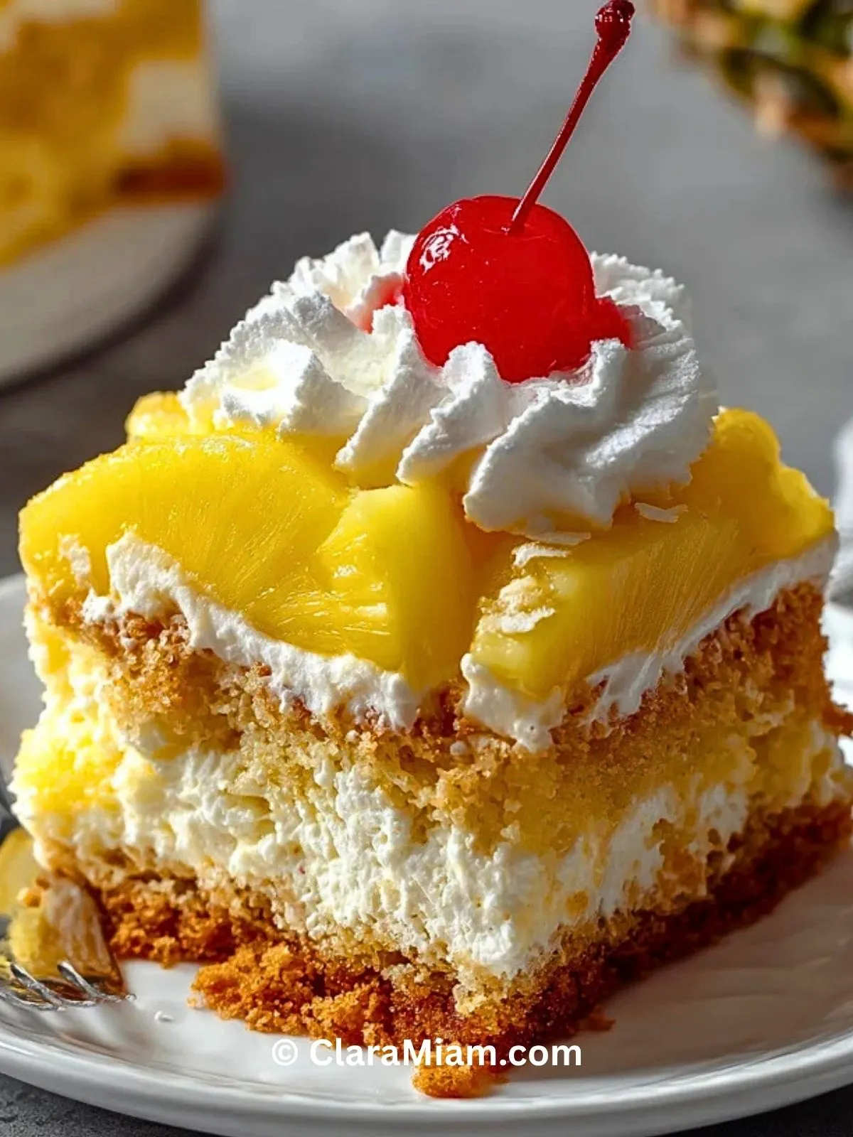 Le Gâteau Ananas Hawaïen Delight est un dessert tropical crémeux et gourmand, composé d’une base biscuitée croustillante, d’une garniture fondante au fromage frais, d’un nappage à l’ananas brillant et d’une décoration à la noix de coco, crème fouettée et cerises. Parfait pour un anniversaire, un dessert d’été ou une occasion festive en famille.