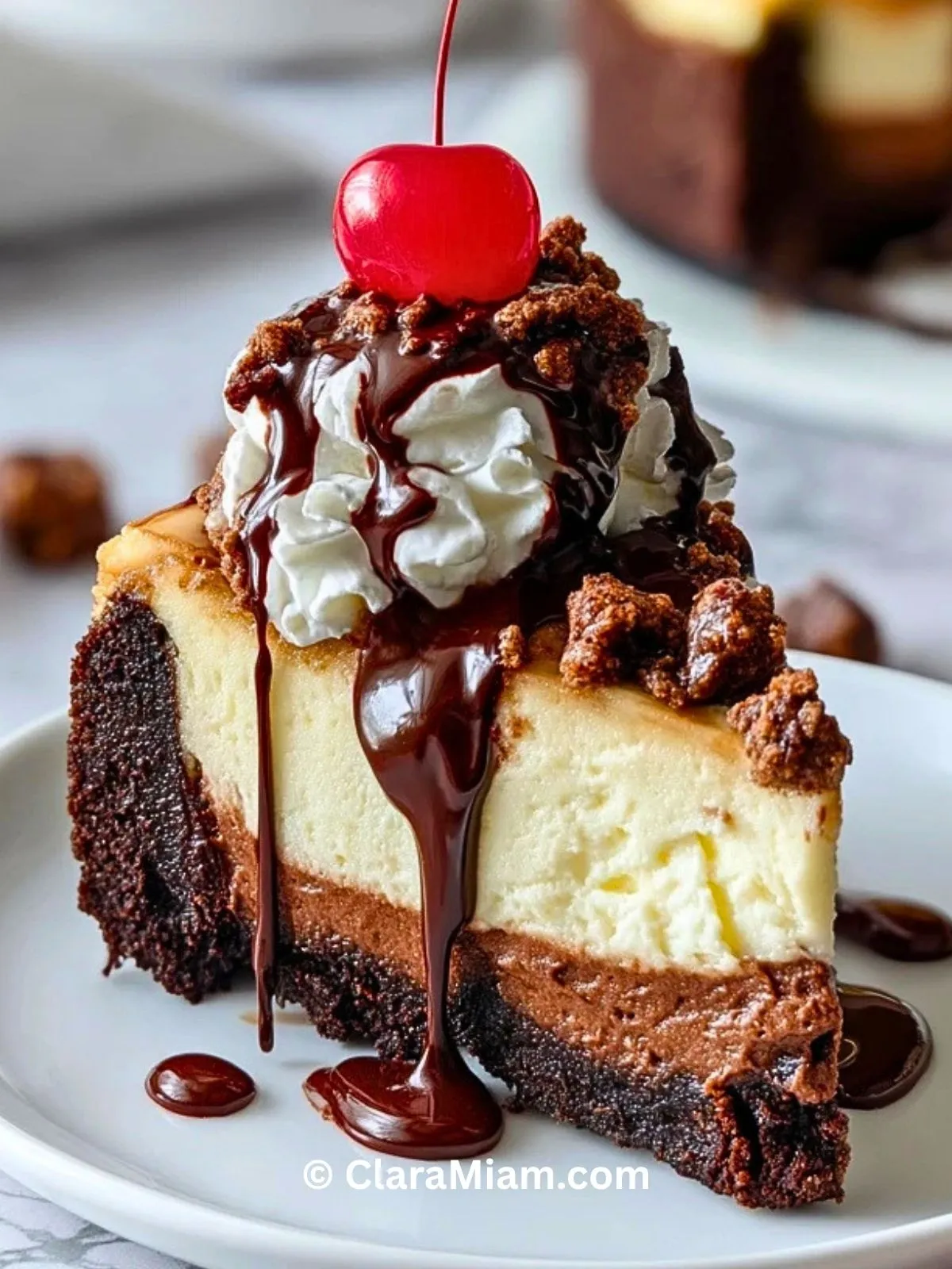 J’aime aussi cette recette parce qu’elle crée un vrai effet “waouh” sans demander des techniques compliquées. Le contraste entre la fraîcheur du gâteau au fromage blanc, l’intensité du brownie et la gourmandise de la garniture transforme ce dessert en pièce maîtresse, parfaite pour un repas de fête, un anniversaire ou simplement une envie de chocolat assumée.