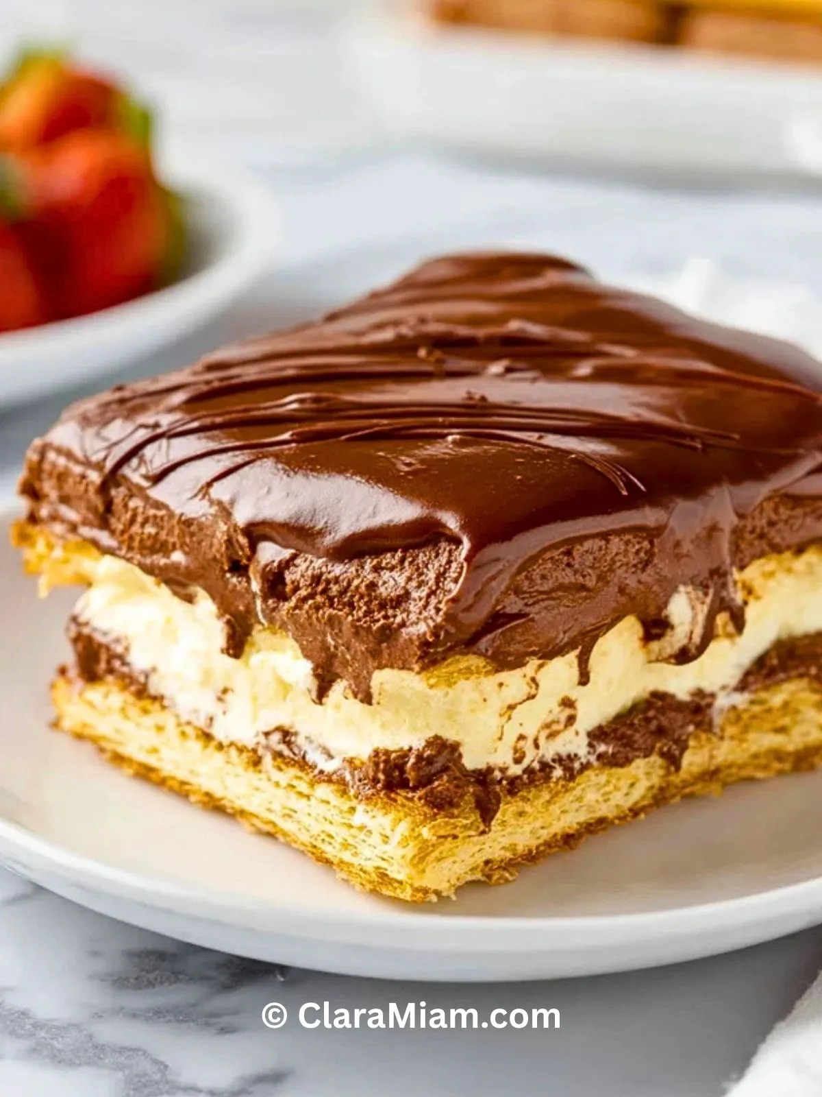 Ce gâteau est à la fois simple à réaliser, ne demande pas de cuisson au four, et il se bonifie après quelques heures au frais. Les saveurs se mêlent à merveille, entre la douceur de la crème pâtissière vanillée et la richesse du glaçage au chocolat. Parfait pour toutes les occasions !