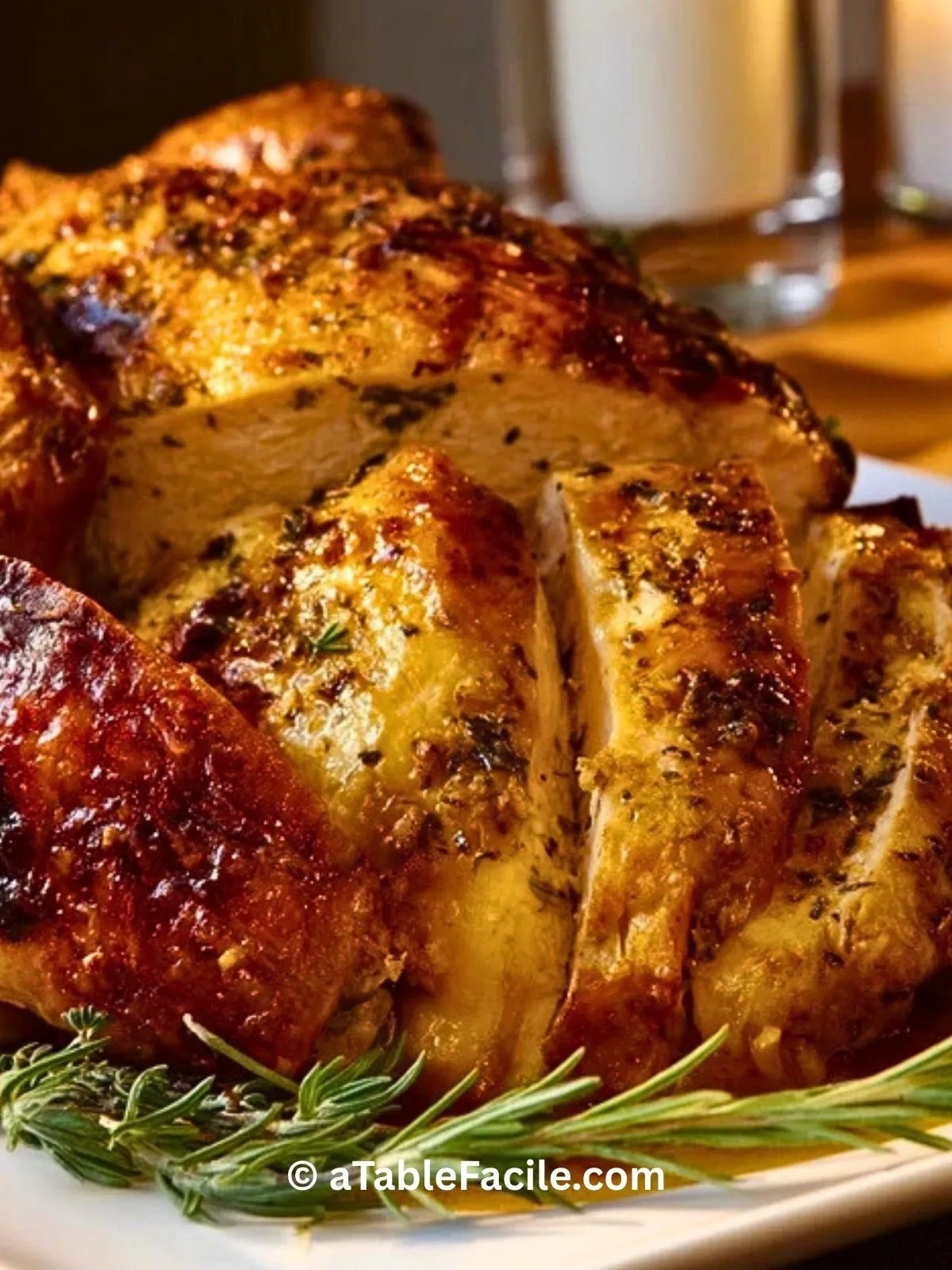 Dinde de Thanksgiving rôtie au beurre aux herbes, moelleuse et croustillante, parfaite pour un repas familial. Facile à préparer, savoureuse, idéale pour impressionner vos invités lors des fêtes.