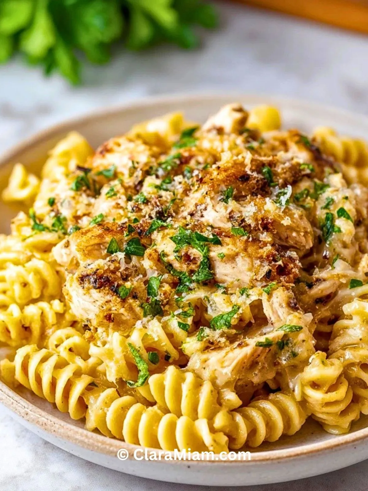 Vous allez adorer cette recette parce qu’elle combine la douceur d’une sauce crémeuse avec le caractère de l’ail et le goût profond du parmesan. Le poulet apporte une belle texture et rend le plat complet, tandis que les pâtes retiennent parfaitement la sauce à chaque bouchée.