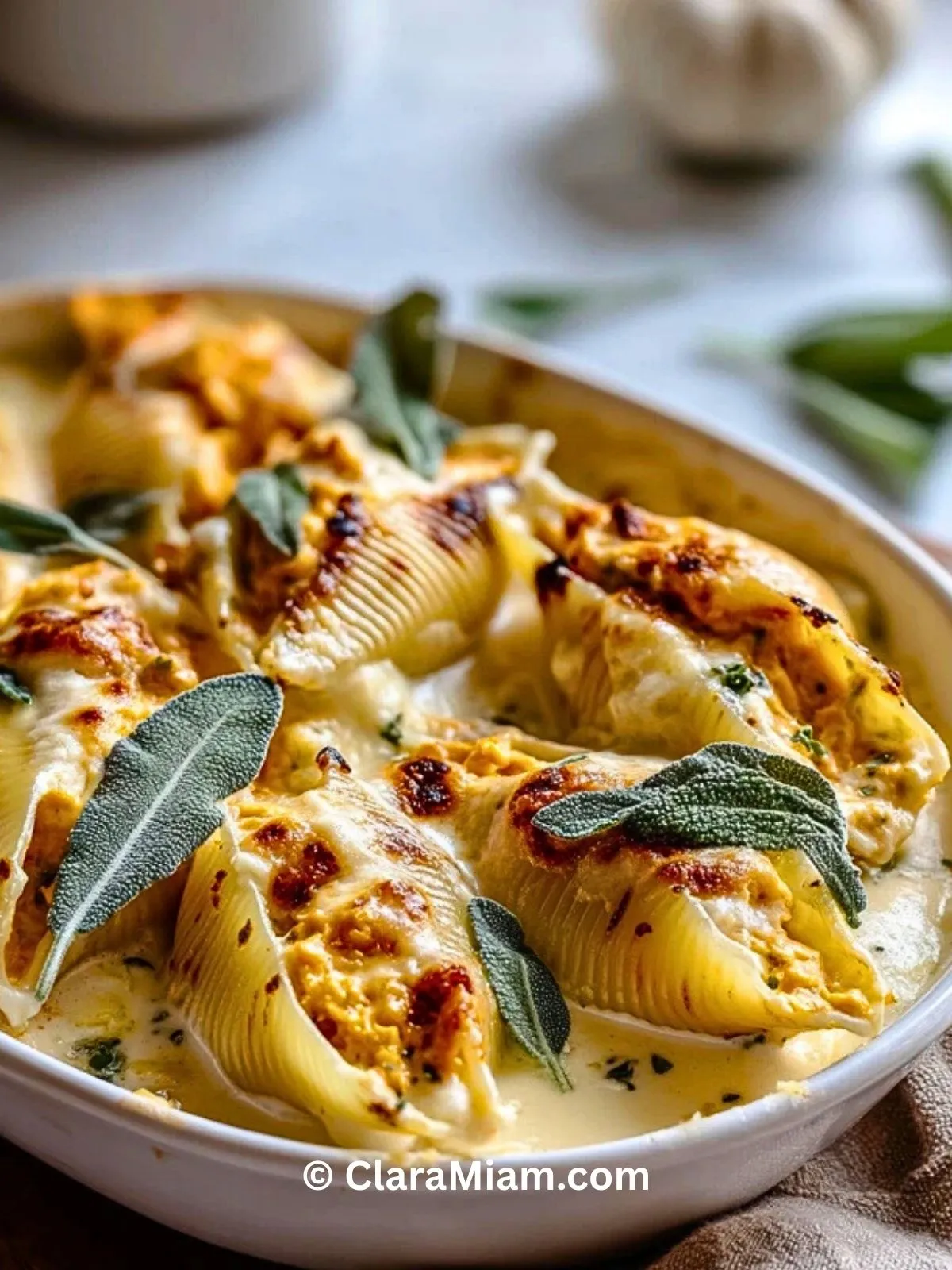 Pâtes Farcies À La Courge Et Gouda Avec Sauce Alfredo Au Beurre Brun Et Sauge est un gratin de coquilles géantes garnies de purée de courge rôtie et de gouda fondant, nappées d’une sauce Alfredo au beurre noisette parfumée à la sauge fraîche. Un plat réconfortant et généreux, parfait pour un dîner d’automne ou de fête.