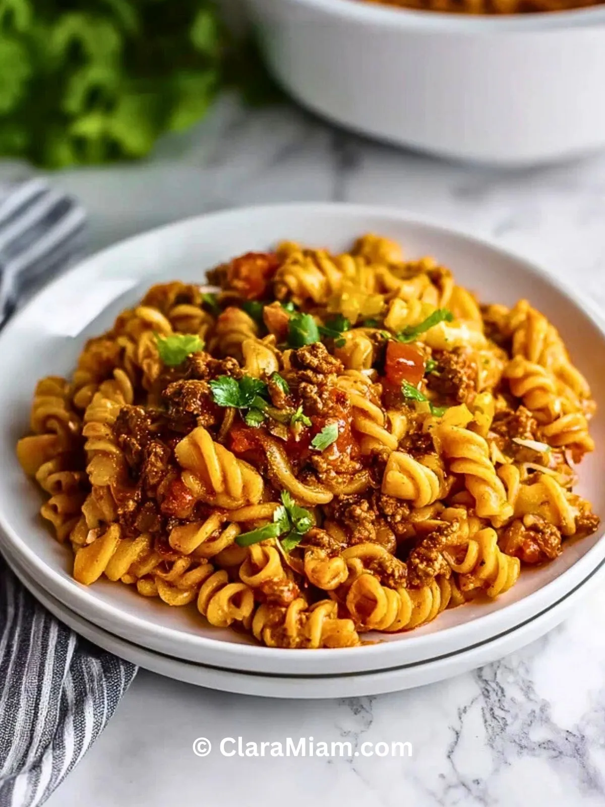 Vous allez adorer cette recette parce qu’elle réunit deux grands favoris dans une seule assiette : les pâtes et les saveurs de tacos. Le résultat est à la fois fondant, épicé juste comme il faut et parfaitement réconfortant. Grâce à la mijoteuse, les ingrédients ont le temps de bien se mêler, ce qui donne une sauce savoureuse qui enrobe chaque bouchée.