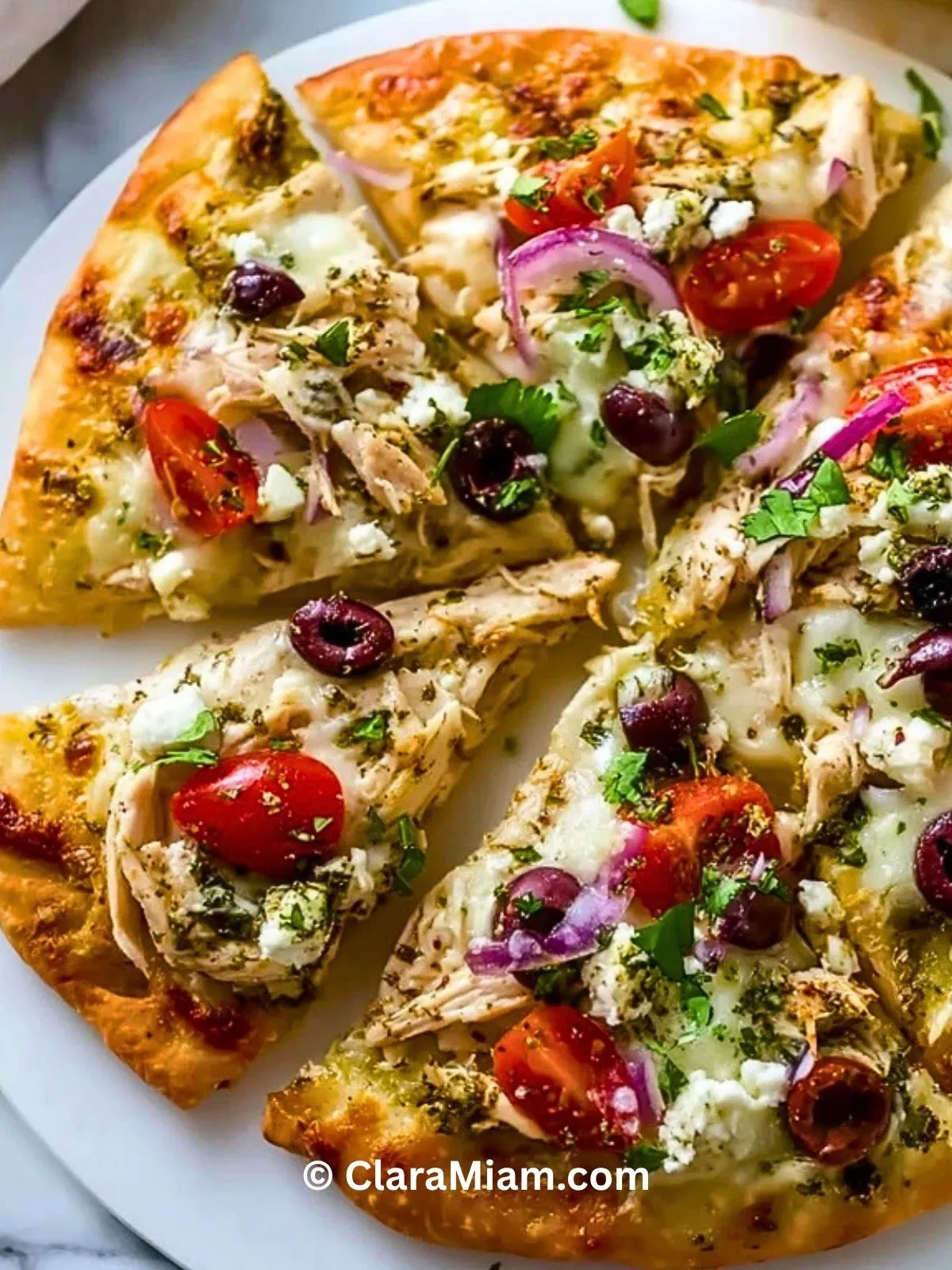 Keywords: pizza méditerranéenne au poulet, pizza poulet feta, pizza olives tomates cerises, recette pizza maison facile, pizza pesto poulet
