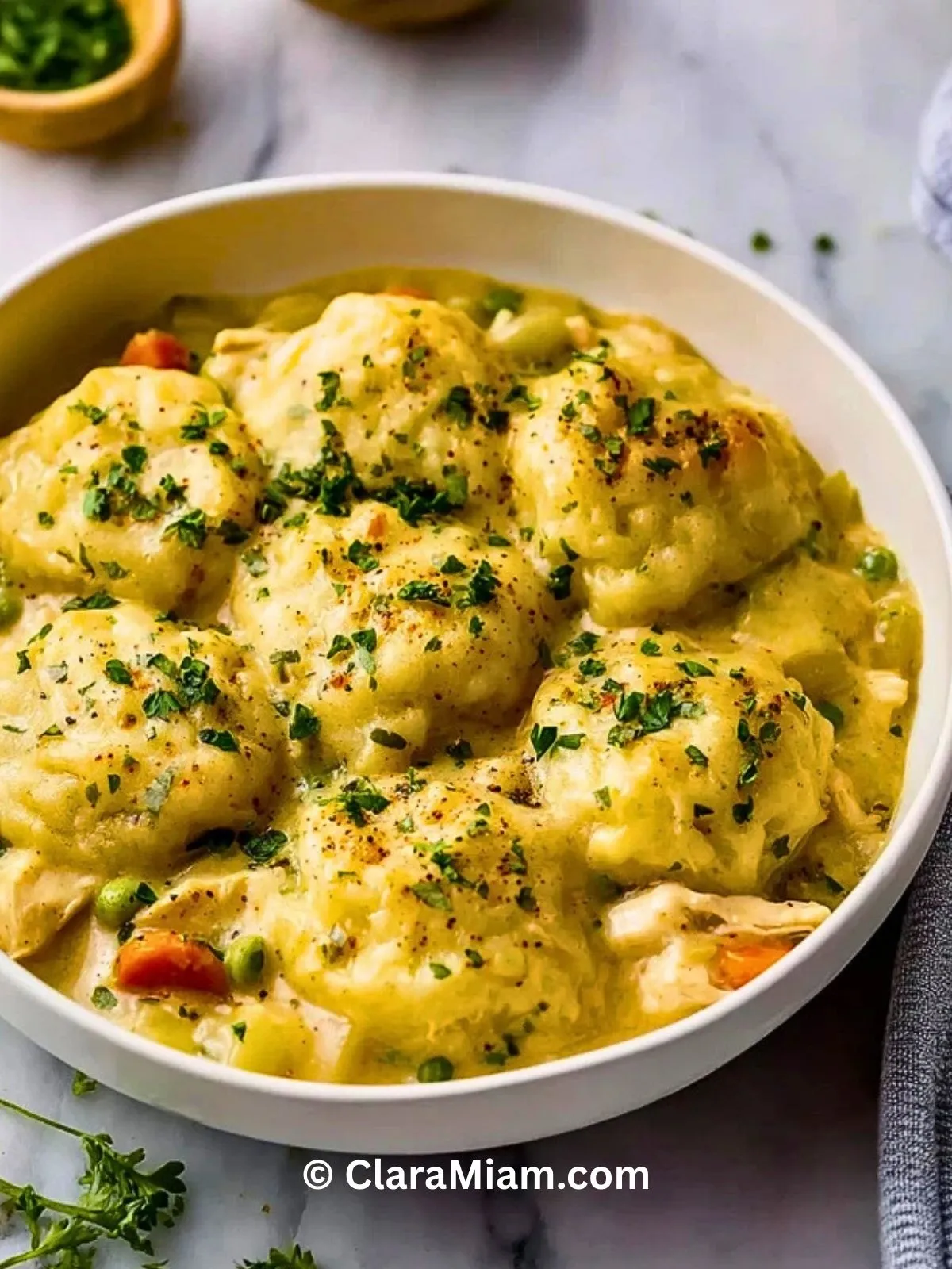 Coupez le poulet en morceaux de taille similaire pour une cuisson uniforme. Versez le bouillon progressivement afin d’obtenir une sauce lisse et sans grumeaux. Pour des galettes bien moelleuses, mélangez la pâte juste ce qu’il faut et évitez de soulever le couvercle trop souvent pendant la cuisson. J’aime aussi ajuster l’épaisseur de la sauce avant d’ajouter les galettes, car elles absorbent une partie du liquide pendant la cuisson.