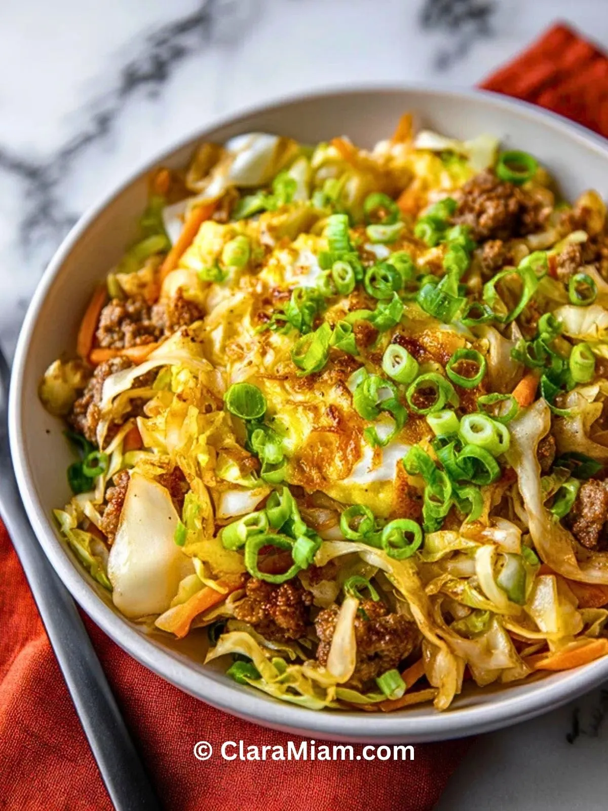 Ajoute le mélange de chou et les carottes dans la poêle. Fais sauter 3 à 5 minutes, jusqu’à ce que le chou commence à tomber tout en restant légèrement croquant. Verse la sauce préparée sur la viande et les légumes, mélange bien pour enrober uniformément. Laisse cuire encore 2 à 3 minutes pour que les saveurs se mélangent et que la sauce réduise légèrement.