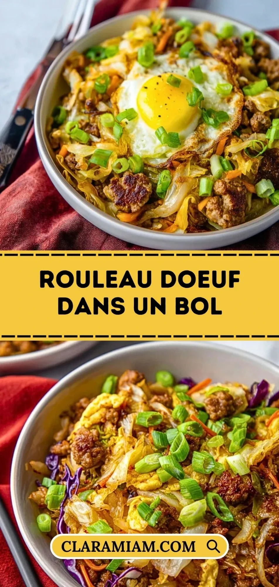 Je suis tombé amoureux de ce plat dès la première bouchée : toute la garniture d’un rouleau de printemps frit, mais servie bien chaude dans un bol, sans la moindre friture. Ce Rouleau DOeuf Dans Un Bol mélange viande hachée savoureuse, chou croquant, carottes, gingembre, ail et une sauce légèrement sucrée salée. Le tout est couronné d’un oeuf au plat au jaune coulant qui vient napper chaque bouchée.