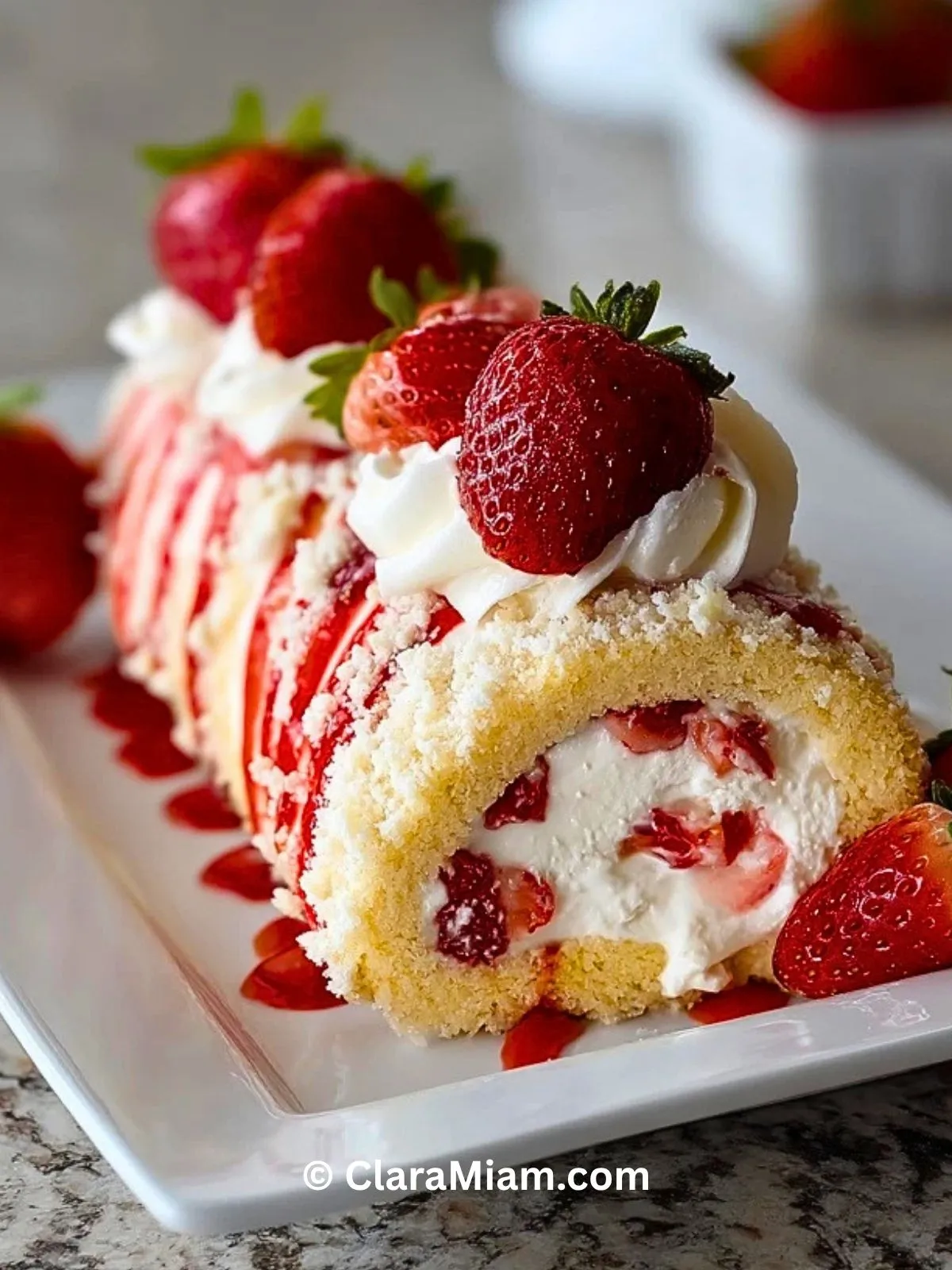 Au moment de servir, je nappe le roulé d’un filet de coulis ou de confiture de fraises légèrement détendue, j’ajoute quelques rosaces de chantilly, des morceaux de fraises fraîches, un peu de sucre glace et quelques feuilles de menthe. Le résultat est frais, gourmand et vraiment irrésistible.