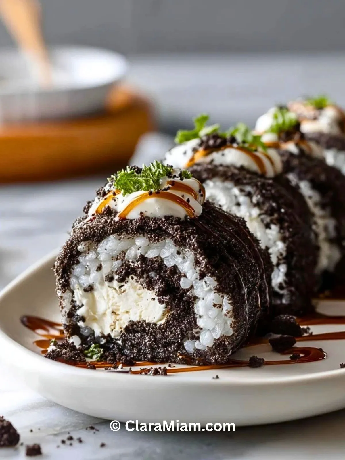 Après le temps de repos, retirez le papier, parez éventuellement les extrémités pour une finition plus propre, puis ajoutez un peu de crème sur le dessus. Saupoudrez de miettes d’Oreo, versez quelques traits de chocolat fondu et terminez avec une petite feuille de menthe si vous aimez cette présentation. Découpez en tranches épaisses pour mettre en valeur la spirale intérieure.