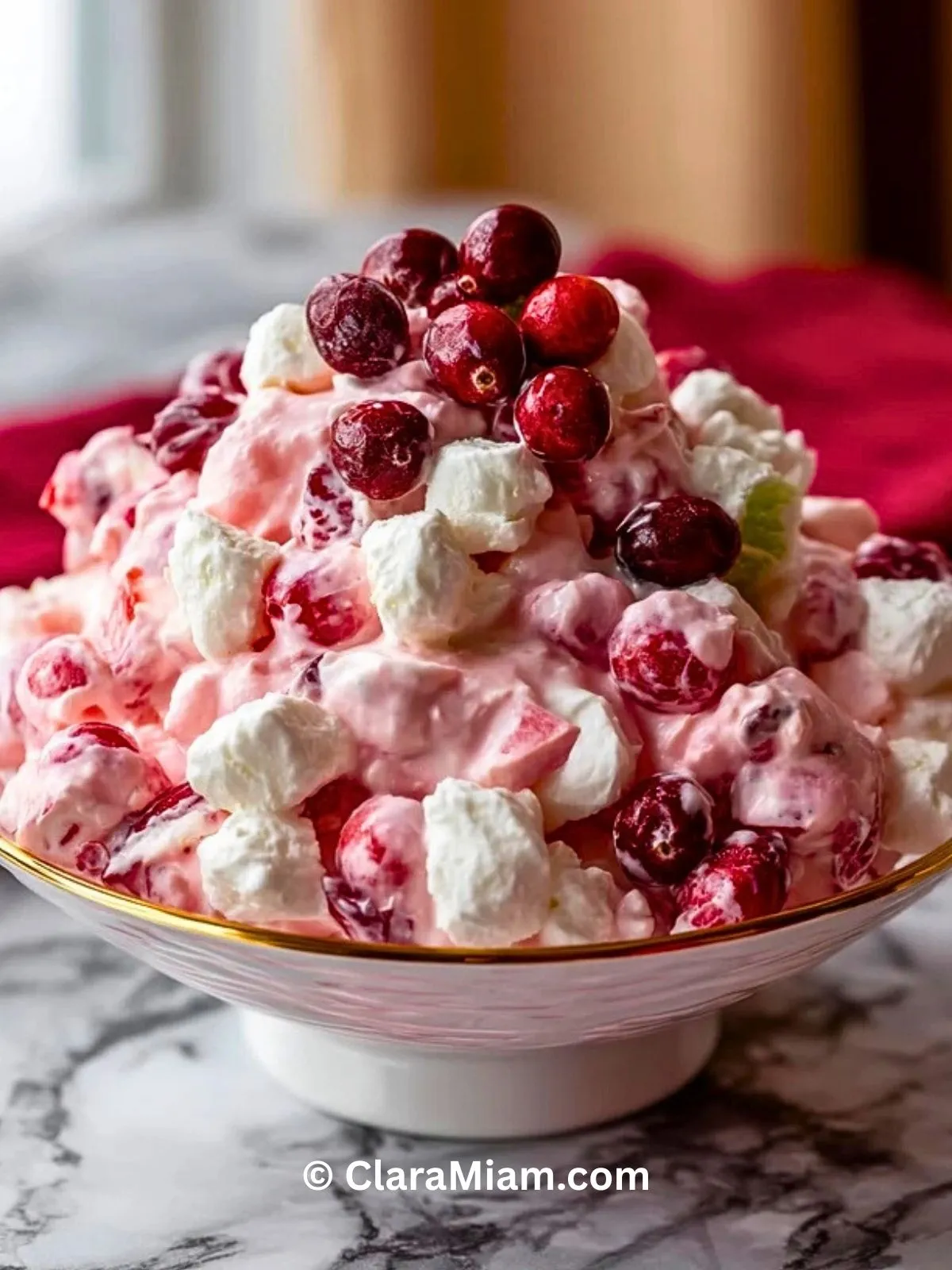 Cette salade sucrée est rapide à préparer, ne demande presque aucune cuisson et apporte une touche festive immédiate. Elle marie l’acidité vive des canneberges avec la douceur des guimauves miniatures et une crème onctueuse qui lie le tout. C’est aussi une excellente idée pour les grandes tablées, car elle se prépare en grand saladier et se sert très facilement.
