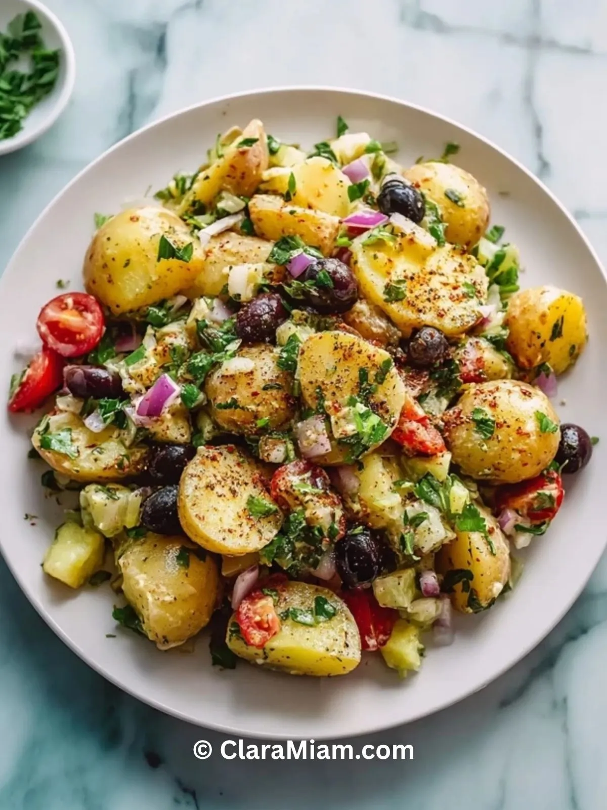 Cette Salade De Pommes De Terre Méditerranéenne Rapide est une recette fraîche, facile et savoureuse, parfaite pour un déjeuner léger, un buffet d’été ou un accompagnement convivial. Préparée avec des pommes de terre fondantes, de la feta, des olives, du concombre et des herbes fraîches, elle offre des saveurs méditerranéennes équilibrées et une préparation rapide pour tous les jours.