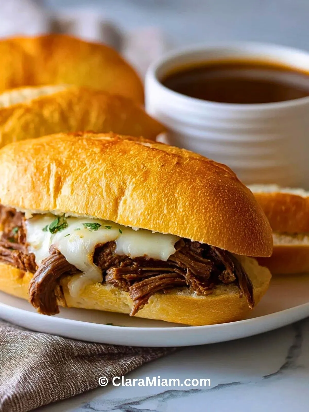 Ces sandwichs sont l’exemple parfait de la cuisine “effort minimum, plaisir maximum”. La mijoteuse fait tout le travail : la viande mijote doucement dans un mélange de bouillon, de vin, d’ail et d’herbes, ce qui donne un jus riche et savoureux pour l’imbiber au moment de servir.