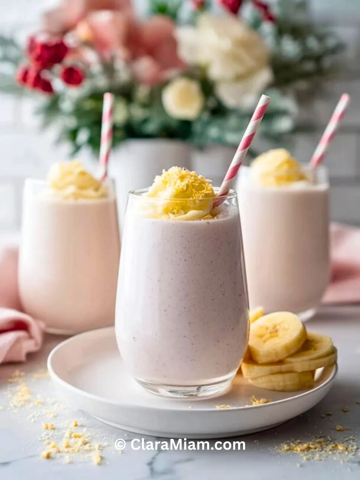 Répartissez le smoothie dans de jolis verres. Ajoutez un nuage de crème fouettée sur le dessus, puis terminez avec des copeaux de chocolat blanc ou une pincée de noix de coco râpée. Servez immédiatement avec une paille pour profiter de la fraîcheur et de la texture parfaite.
