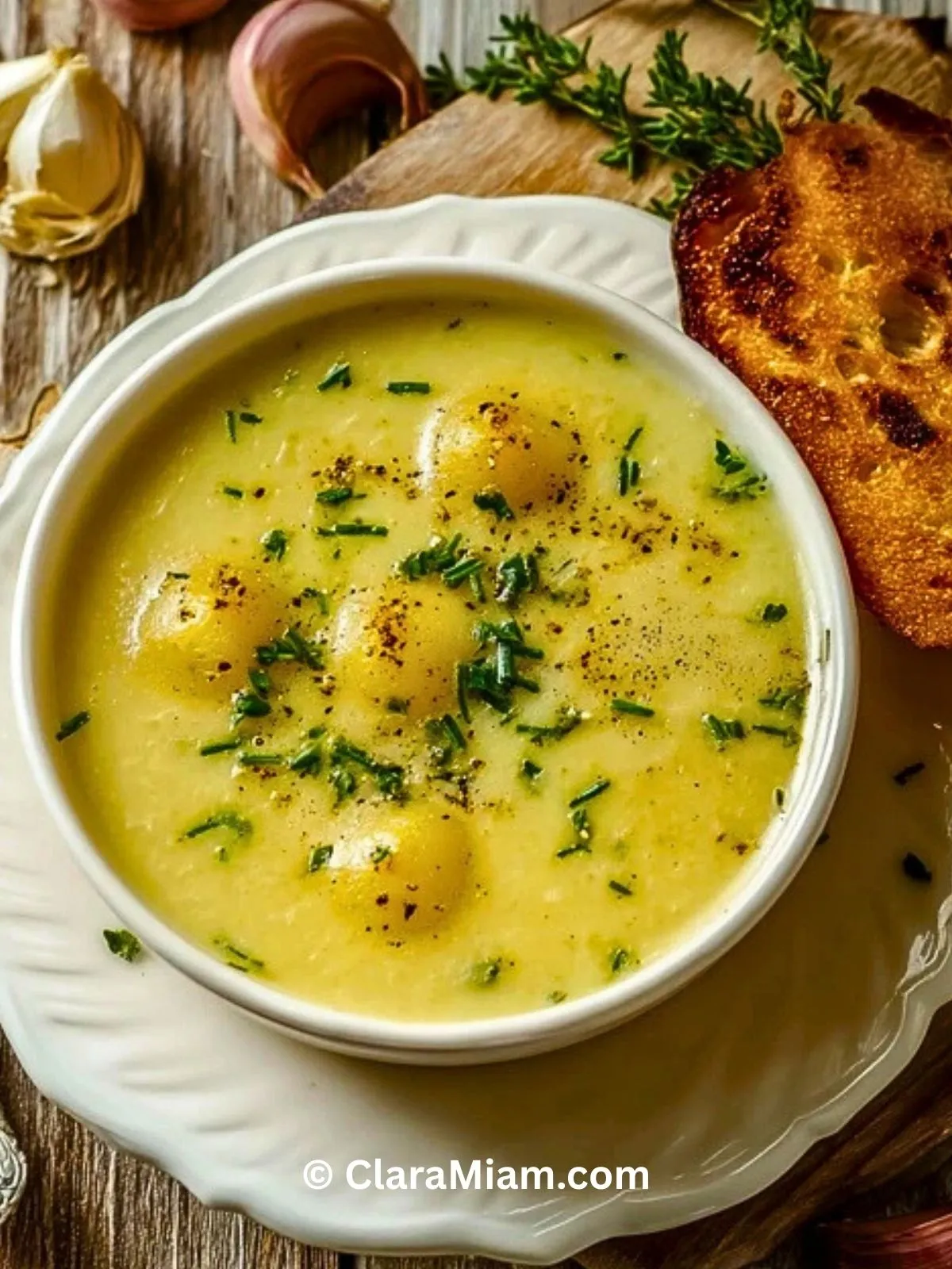 Keywords: soupe à l’ail, recette traditionnelle, pain rassis, soupe paysanne