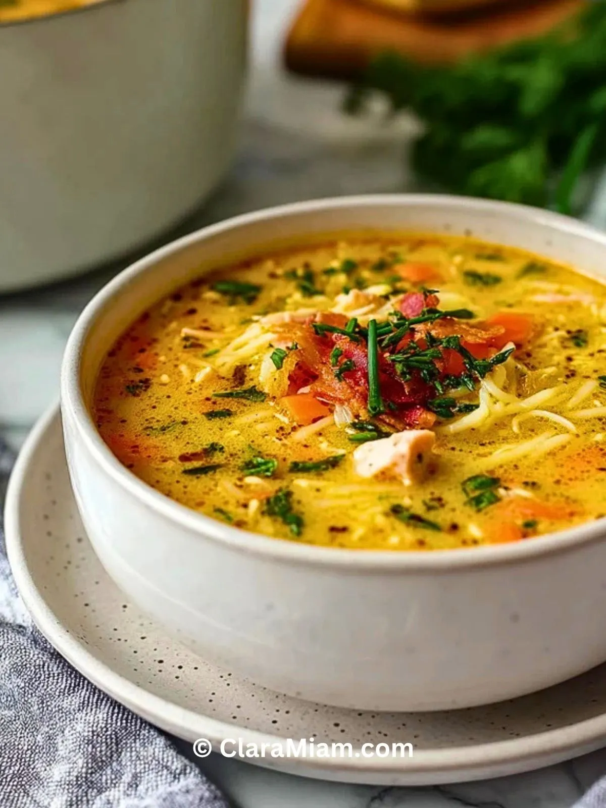 Keywords: soupe crémeuse au poulet et bacon, soupe poulet bacon, soupe maison réconfortante, soupe crémeuse facile, soupe poulet pâtes