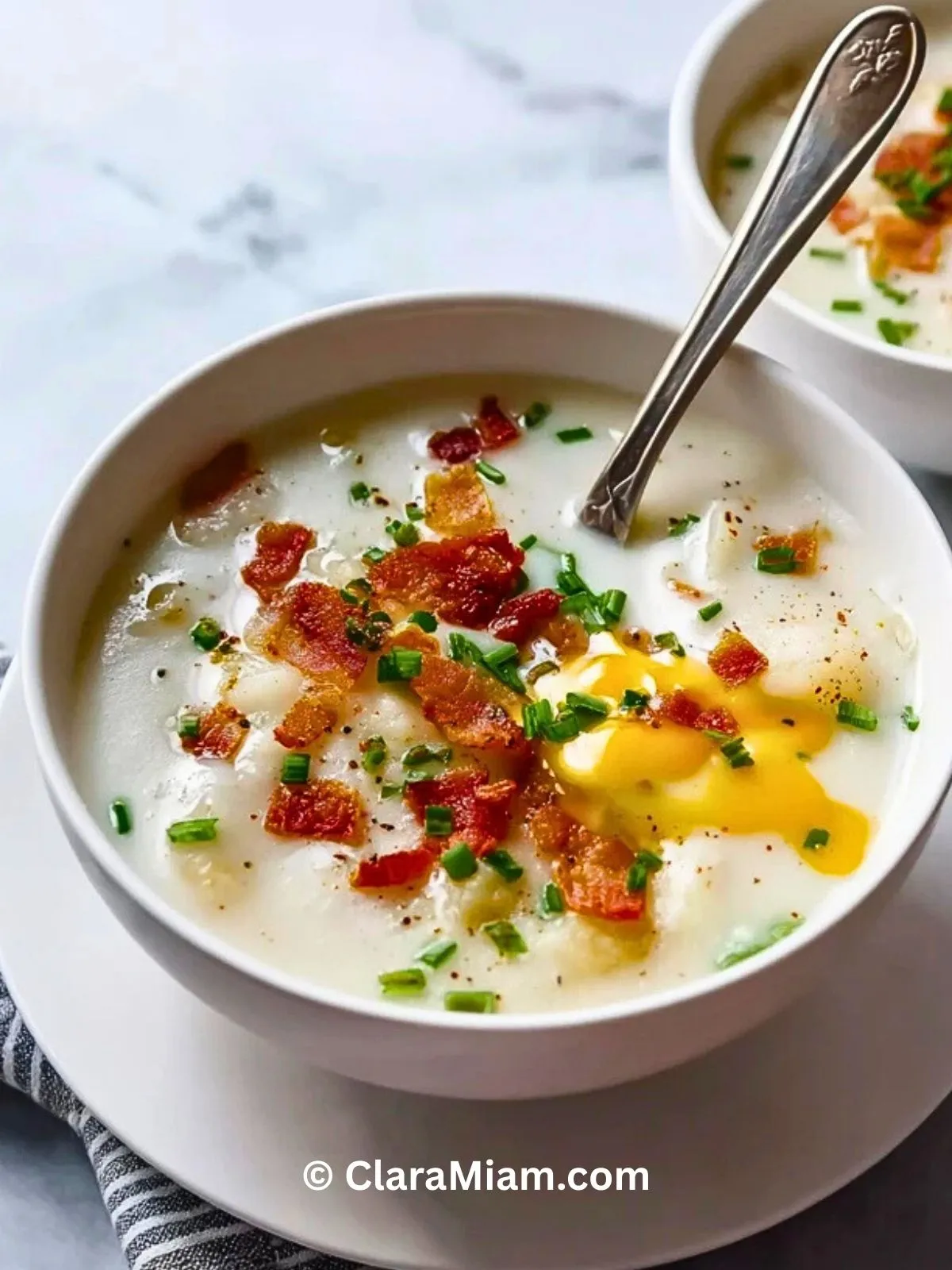 Ce que j’aime particulièrement avec cette soupe, c’est qu’elle a tout d’un plat complet : des pommes de terre fondantes, une base onctueuse au bouillon et au lait, et toutes les garnitures d’une pomme de terre au four « loaded », mais en version cuillère. Je peux la servir en entrée gourmande ou en plat principal avec un bon morceau de pain, et tout le monde en redemande.
