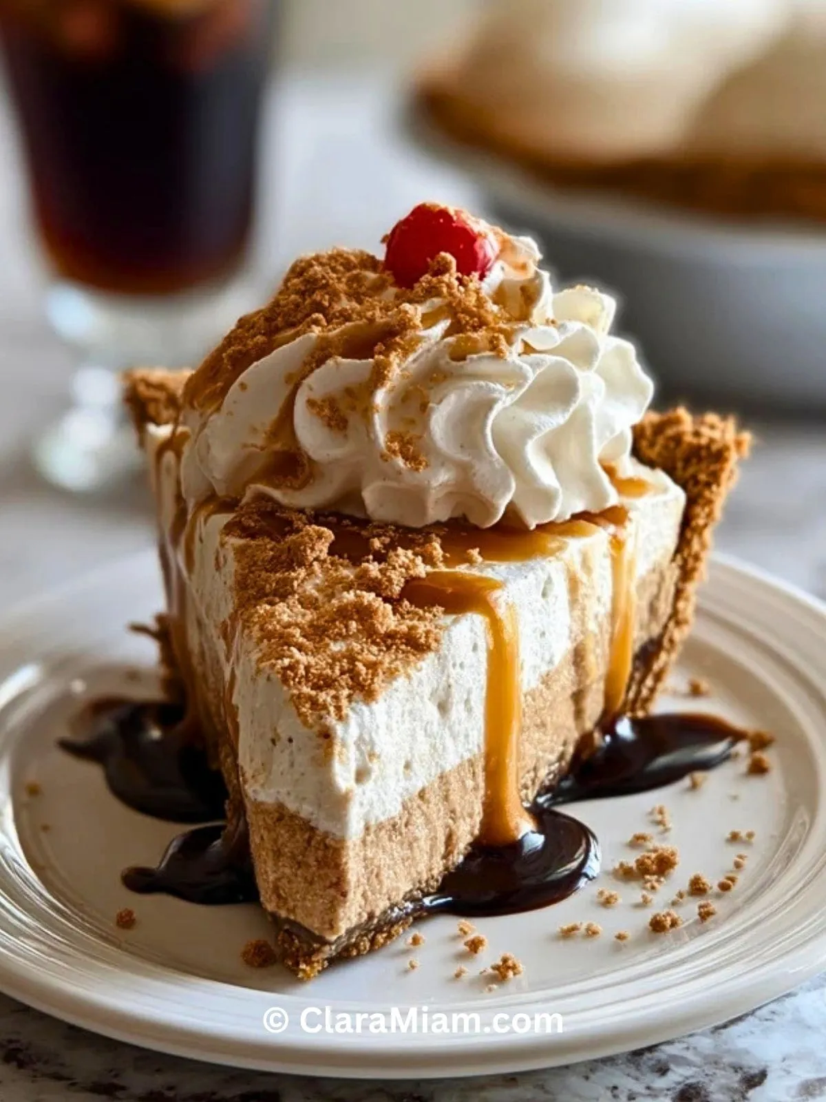 Au moment du service, ajoutez des rosaces de crème fouettée, un filet de sauce caramel, un filet de sauce au chocolat, quelques miettes de biscuits et une cerise sur le dessus. Servez bien frais pour profiter d’une texture nette et fondante à la fois.