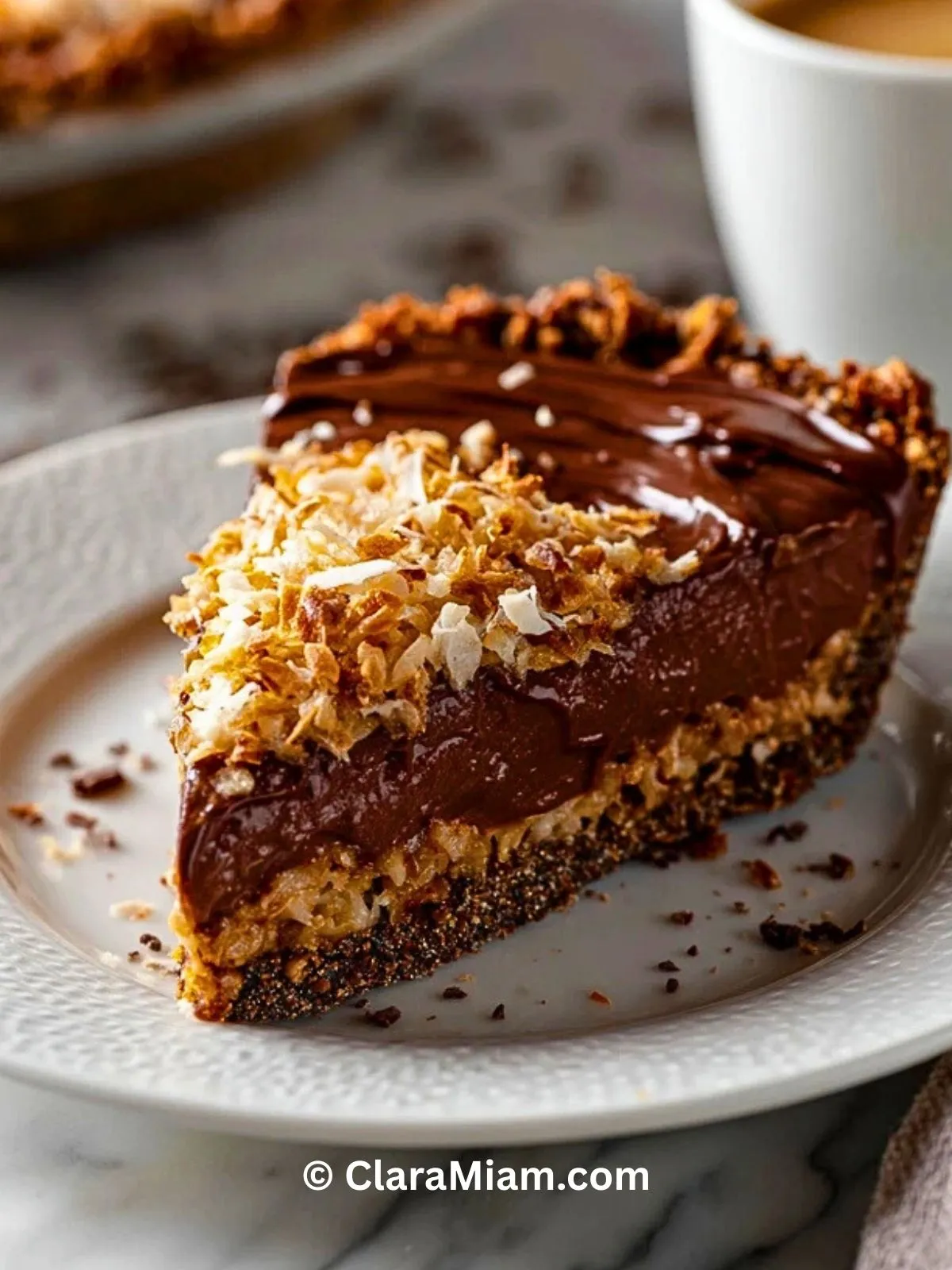 Cette Tarte Allemande Au Chocolat Sans Cuisson séduit d’abord par ses textures. La croûte est ferme et savoureuse, la couche coco-noix de pécan apporte du relief, et la ganache chocolatée donne une finition fondante absolument irrésistible.