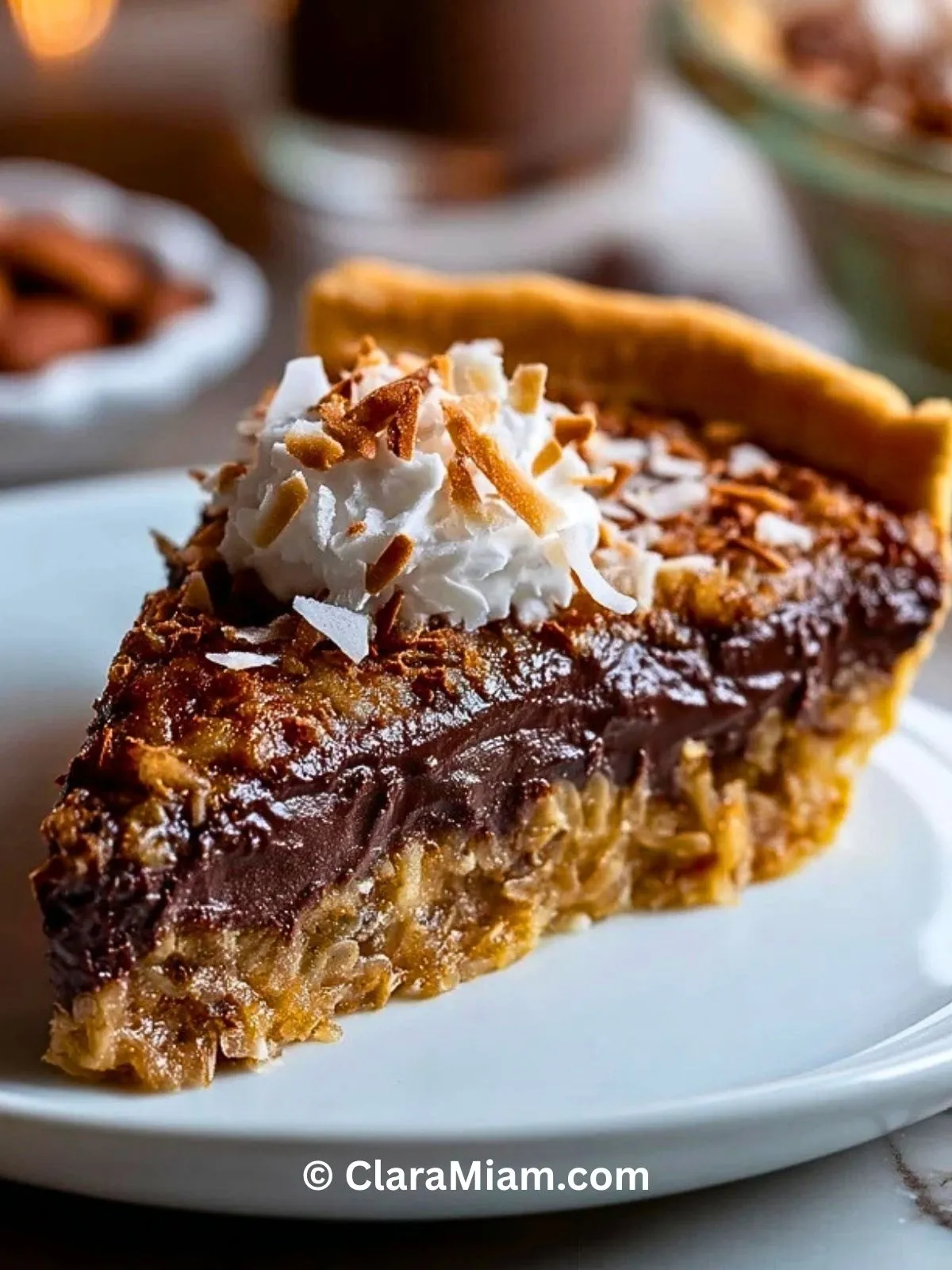 Ce que j’aime par-dessus tout, c’est qu’elle a tout le charme du fameux gâteau au chocolat allemand (German chocolate cake) mais en version tarte, plus simple à servir et parfaite pour les grandes tablées. Je la prépare souvent la veille : la garniture se tient mieux, les saveurs se développent, et je n’ai plus qu’à ajouter la crème fouettée et la noix de coco grillée au moment de passer à table.