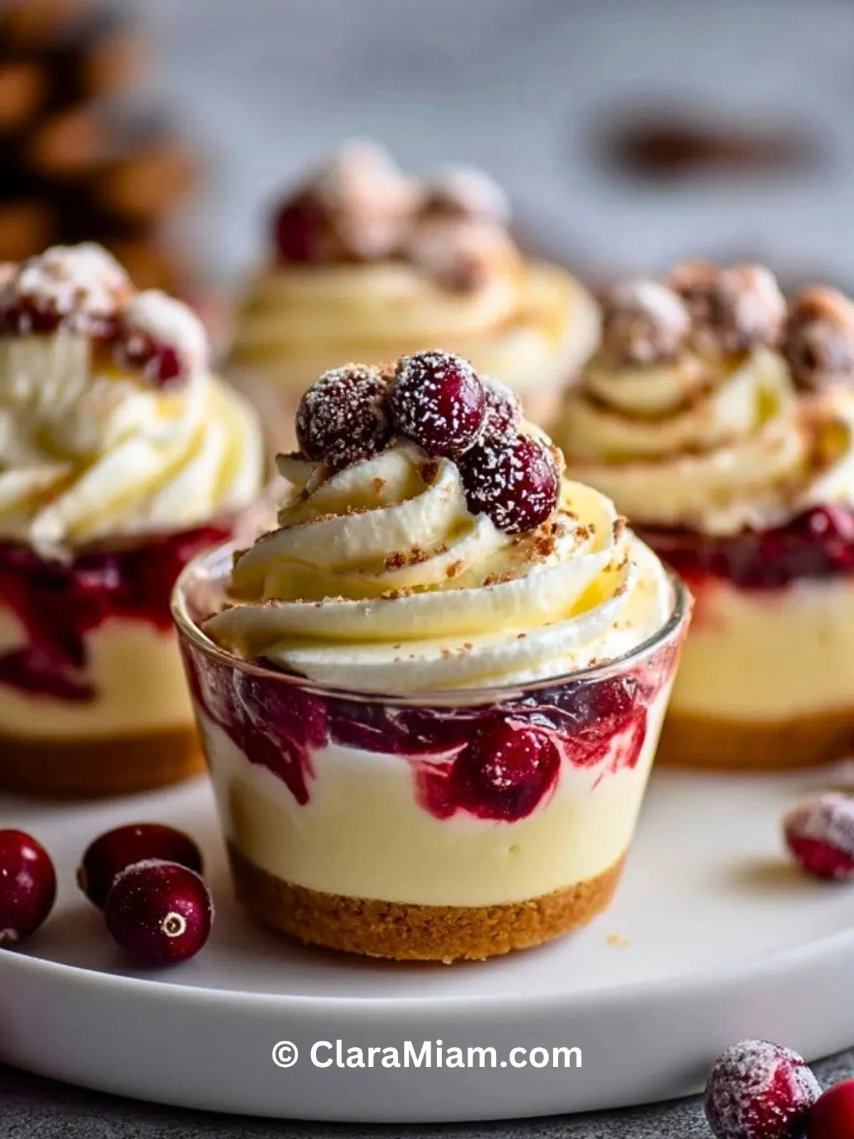 Je conseille d’utiliser des verres transparents pour mettre en valeur les couches, puis de pocher la crème sur le dessus pour une finition nette. Quelques canneberges enrobées de sucre, un nuage de sucre glace et un peu de miettes de biscuits suffisent à donner un résultat très raffiné.